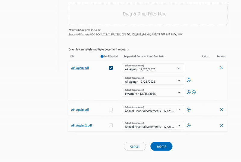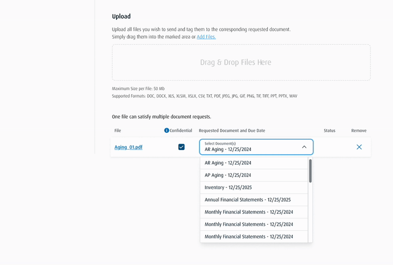 We are fully committed to the compliance of our loans and meeting the reporting requirements in our loan agreements, but if there is a way to accomplish this that is more efficient, it would be great. Between this and the time to upload financial statements, this will be an extra hour of added time to these processes just for uploading. If there is a way to upload the docs in bulk and then tag them, that would be preferred.”