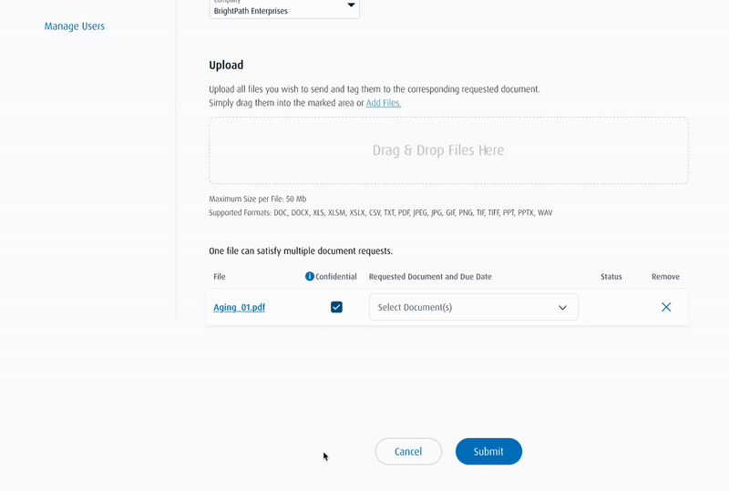 Once users have uploaded their files, they would see the status of the file upload and submit their files to their relationship managers for review and approval.
