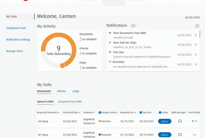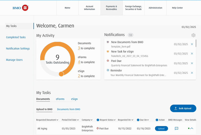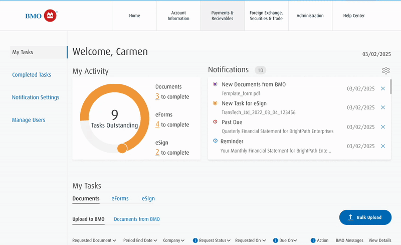 The BMO eTasks portal is a hub for commercial clients to submit their financial documentation to their bankers.