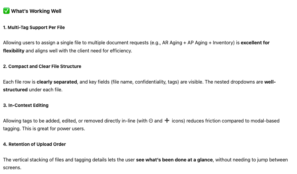 We had already decided we would be moving forward with a bulk upload and tagging feature, so the fact that Chat GPT reaffirmed this as one of the best design solutions indicated we were moving in a positive direction.